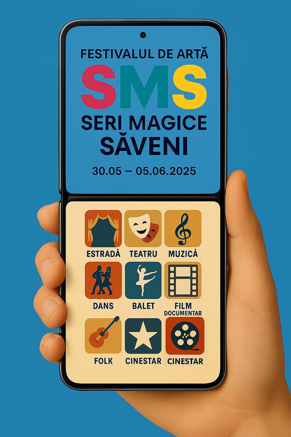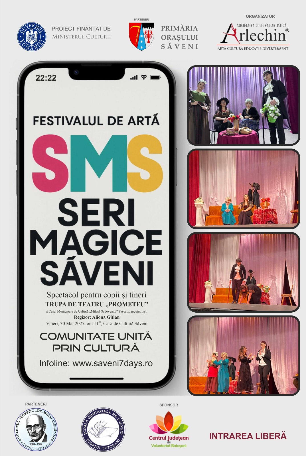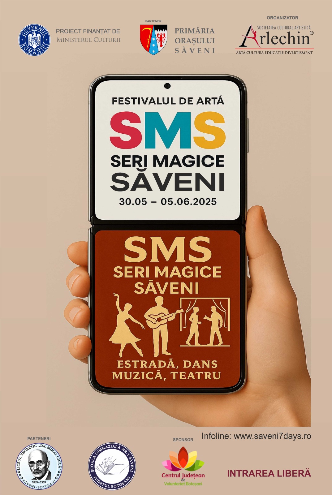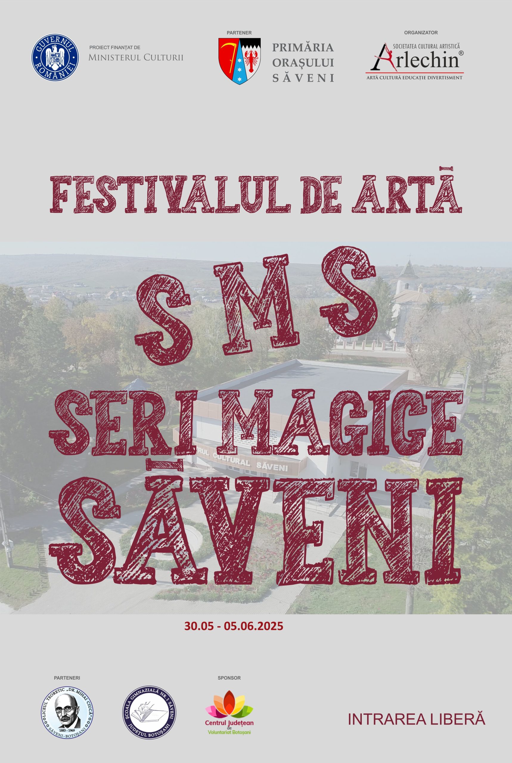 The "SMS – Magical Evenings in Săveni" Art Festival is a nationally significant cultural event, reaching its fourth edition in 2025. It is organized by the "Arlechin" Cultural Artistic Society Association of Botoșani, with the support of the Ministry of Culture. The event benefits from the active involvement of key partners in the educational and community life of the region: the Săveni Town Hall, "Dr. Mihai Ciucă" Theoretical High School, Săveni Secondary School No. 1, and the Botoșani County Volunteer Center.