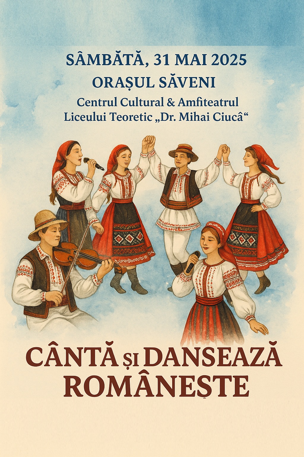 Meanwhile, at the Amphitheater of "Dr. Mihai Ciucă" Theoretical High School in Săveni, two educational-cultural activities take place. At 12:00 PM, the public is invited to a workshop exploring traditional folk games, followed by the launch of the book "Traditional Games from Botoșani County," in the presence of the author, master choreographer Mihai Chelărescu.
