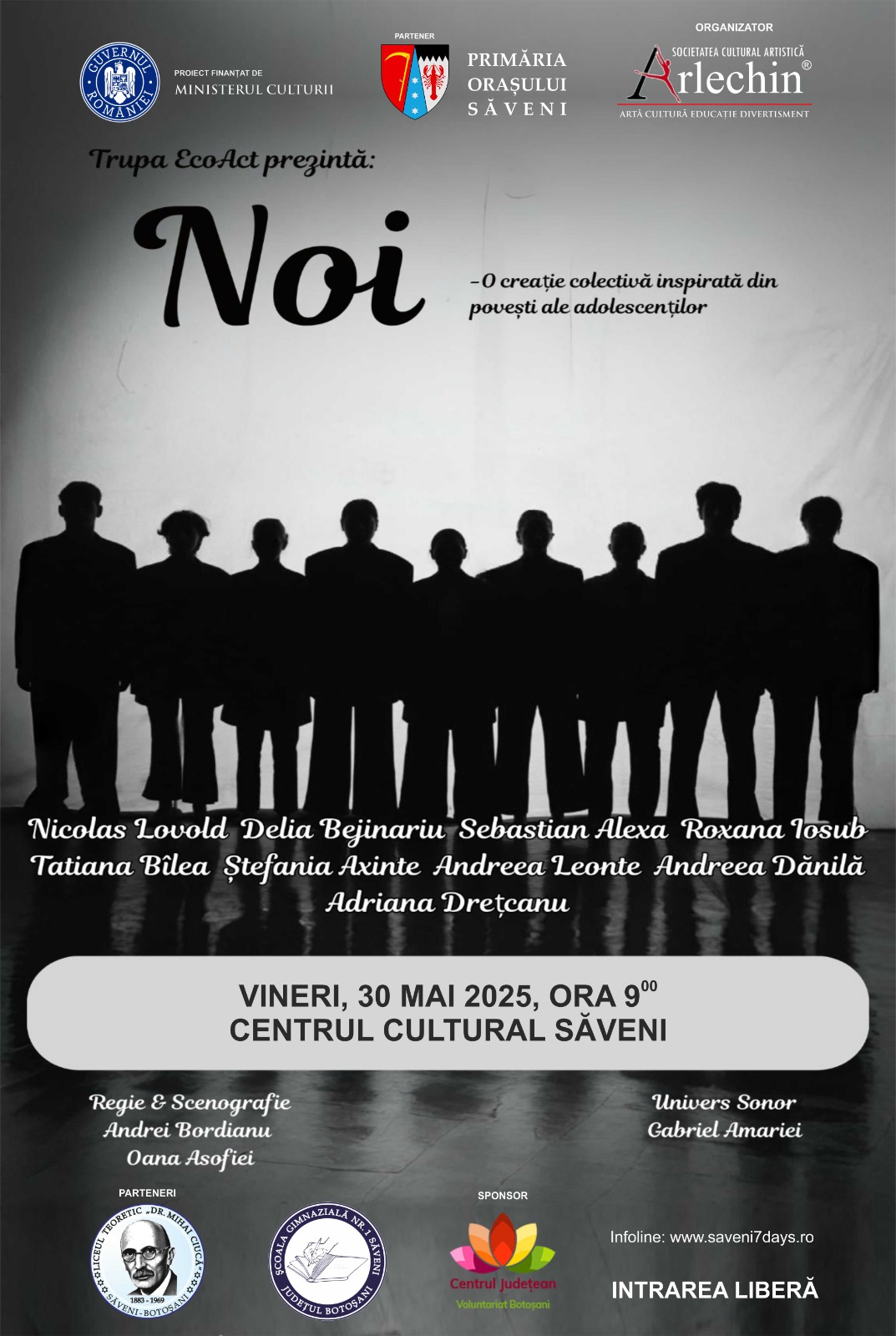 Programul debutează la ora 10:00 la Centrul Cultural Săveni cu un spectacol de teatru dedicat tinerilor, care abordează teme relevante pentru generația actuală – identitate, comunicare, responsabilitate socială – prin limbaj scenic contemporan. Spectacolul este prezentat de o trupă de tineri actori și studenți de la universități partenere din țară, iar publicul este invitat să participe la o experiență artistică interactivă și educativă.